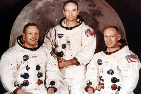 Explication : sur cette photo historique, on note le sourire d’Armstrong (assis à gauche, c’est le commandant du vaisseau) et celui d’Aldrin (assis à droite) mais c’est l’expression plus sérieuse de Collins (debout, au centre), qui retient le plus l’attention.