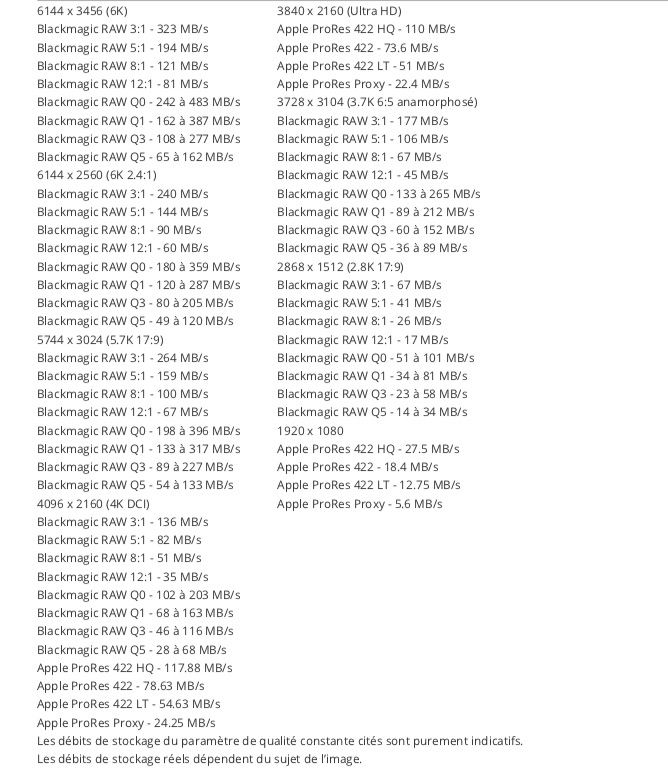 Les 4 débits constants sont les suivants : RAW 3:1, RAW 5:1, RAW 8.1, RAW 12:1. Les débits changent en fonction de la résolution. Au plus bas, tablez sur 17 Mbps en 2,8K. Au plus haut, 323 Mbps en 6K 3:1.