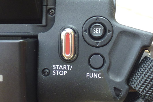 Un second raccourci Func est disponible à l'arrière, accompagné d'un Joystick (SET) dont le maniement est désespérément crispant. En plus, c'est pas très malin d'avoir placé deux boutons si près du déclencheur, car il en résulte des erreurs si l'on tâtonne à l'aveugle, d'autant que le bouton Func peut lui-même servir de déclencheur Start/Stop, situé juste à côté. Quand on vous disait que les ingénieurs de ce camescope avaient bu trop de saké… !