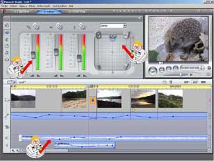L'audio, un des points forts de Studio ! Excusez du peu : 2 pistes indépendantes pour poser des bruitages avec une bibliothèque intégrée d'origine, créer un commentaire avec la fonction Voice Over (très ludique), ajouter à partir d'un CD piloté par le logiciel un extrait musical sélectionné et monté automatiquement, fabriquer de la musique "au mètre" à partir de la bibliothèque SmartSound dont la dernière phrase musicale se terminera "naturellement" juste sur la fin de votre film. Et compatibilité MP3 évidemment. Ouf ! Bon, on aimerait avoir une piste audio en plus pour faciliter par exemple les mixage musicaux mais bon… pas mal déjà, non ? Quant au son direct des rushes, si vous bloquez la piste image à l'aide du petit cadenas à droite, vous manipulerez ainsi la piste audio de manière totalement indépendante de l'image. Sur n'importe quelle piste tout segment audio peut être déplacé, ôté ou remplacé facilement. La durée est réglable avec les mêmes types d'outils que pour l'image.