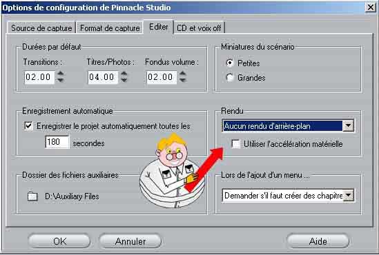Petite astuce dans l'onglet Editer de ce panneau de configuration : si certains effets plantent, décochez dans le cadre Rendu l'option Utiliser l'accélération matérielle. C'est en effet parfois la carte graphique qui a du mal à assurer un affichage correct d'effets spéciaux trop complexes pour sa p'tite tête ! Et si votre PC s'avère quelque peu faiblard, choisissez aussi dans ce même cadre : Aucun rendu d'arrière plan. La visualisation de l'effet sera saccadée dans la visionneuse et la compilation plus longue avant l'exportation finale mais cela vous évitera sûrement quelques plantages. Le seul autre panneau de paramétrages existant dans Studio concerne les options d'exportations. (voir § 3 Diffuser partout).