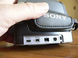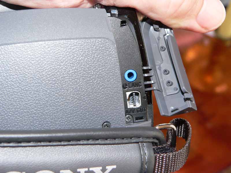 Pas de prises micro et casque sur ce modèle si l'on excepte le raccordement par la griffe avec un accessoire Sony. En revanche, la précieuse prise Lanc - utile notamment pour le pilotage d'un caisson sous-marin - est bien présente sur le camescope.