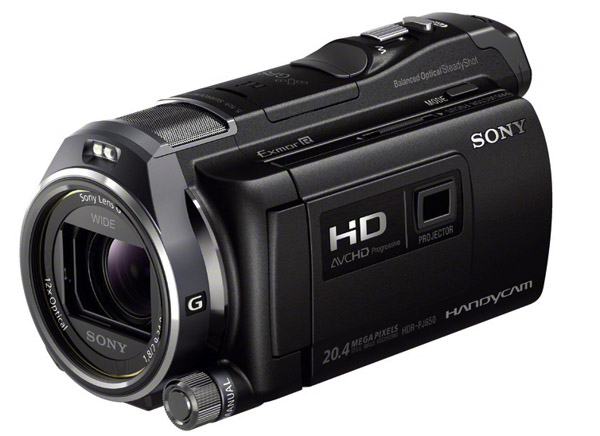 Sony a repris sa logique de picoprojecteur intégré. Il l'a d’ailleurs étendu à tous ses modèles hauts de gamme, signe de sa confiance en ce procédé convivial qui irritera sûrement ceux qui sont certains de ne pas l'utiliser. Pour rappel, le picoprojecteur repose sur un vidéoprojecteur miniature, à base d'une puce DLP (Digital Light Projector) ou LED (Light Emitting Diode) qui projette, depuis un objectif, la source de lumière nécessaire à la vidéoprojection. Parallèlement, 2 hauts-parleurs (situés sur le sommet de l'écran) se chargent du son. Le petit objectif destiné à la vidéoprojection est placé derrière l'écran du camescope. Sony propose depuis 2011 des modèles équipés d'un tel dispositif de picoprojection.