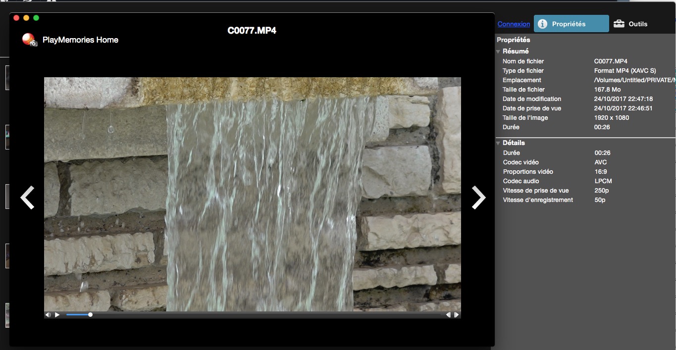 Un des aspects très pratiques de Play Memories Home est de pouvoir visualiser les vitesses de prises de vues dans lesquelles on a filmé. Par exemple ici, on vérifie que l'on a filmé (en Super Slow Motion) en 250 /images/secondes.