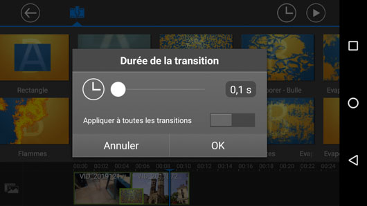 Mieux : la durée de la transition est paramétrable entre 0,1s et 4 secondes. Et on peut décider d'appliquer le changement à une seule des transitions ou à l'ensemble. Qui eût cru que sur une application mobile, cette souplesse serait proposée ? On apprécie. Je vous conseille les transitions les plus discrètes telles que le A/B (fondu-enchaîné) ou le flou de transition. Sinon, d'autres transitions plus ostentatoires sont aussi proposées (Flash, Flamme, Rotation, etc.). On remplace une transition par une autre, très facilement dans la mesure où la dernière transition choisie est celle qui est prise en compte. Notez enfin que 80 transitions sont disponibles avec le Premium. |