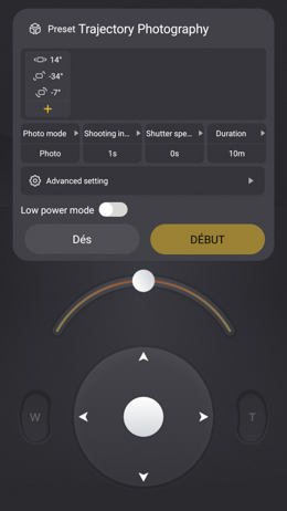 Le contrôle de la vitesse de déplacement de chacun des 3 axes ou la douceur des mouvements (Smooth) sont des paramètres parmi les plus intéressants. Pour la vitesse, si vous souhaitez quelque chose de lent, descendez vraiment autour de 5 à 10, sinon vous ne verrez guère de différence marquée. La force des moteurs bénéficie du mode Autotune qui calibre automatiquement la force des moteurs en tenant compte de la charge embarquée. L'Autotune fait trembler le stabilisateur puis c'est réglé ! Enfin sachez que dans l'obscurité, l'écran s'avère suffisamment lumineux. |