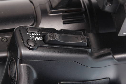 Les boutons Rec Review (lecture des dernières secondes du plan précédent) et Expanded Focus (zoom numérique pour régler le focus finement) sont bien placés et offrent un bon toucher, eux. Toutefois, il est fréquent de déclencher le Rec Review par mégarde lorsqu'on tient le caméscope par sa poignée latérale sans l'utiliser.