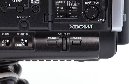 Les deux commandes de menu (la molette sur le flanc gauche et les touches sur la poignée) sont moyennement pratiques. La molette est plus rapide d'usage, les touches sont un peu trop enfoncées dans la poignée pour être ergonomique. Sony a bien fait d'abandonner celle du EX1/R !
